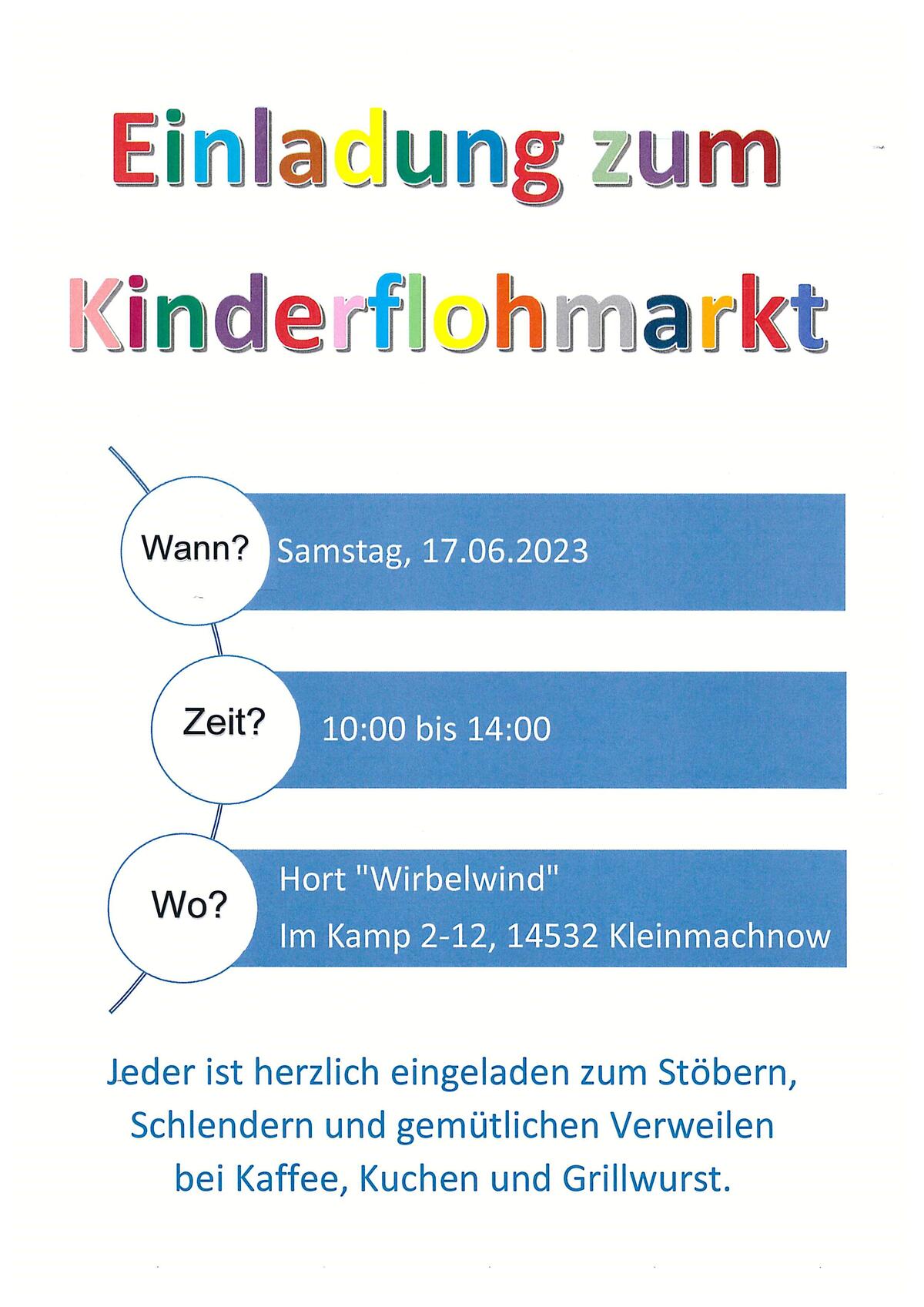 Im Hort "Wirbelwind" findet am Samstag, 17.06.2023 von 10:00 - 14:00 Uhr ein Flohmarkt statt.