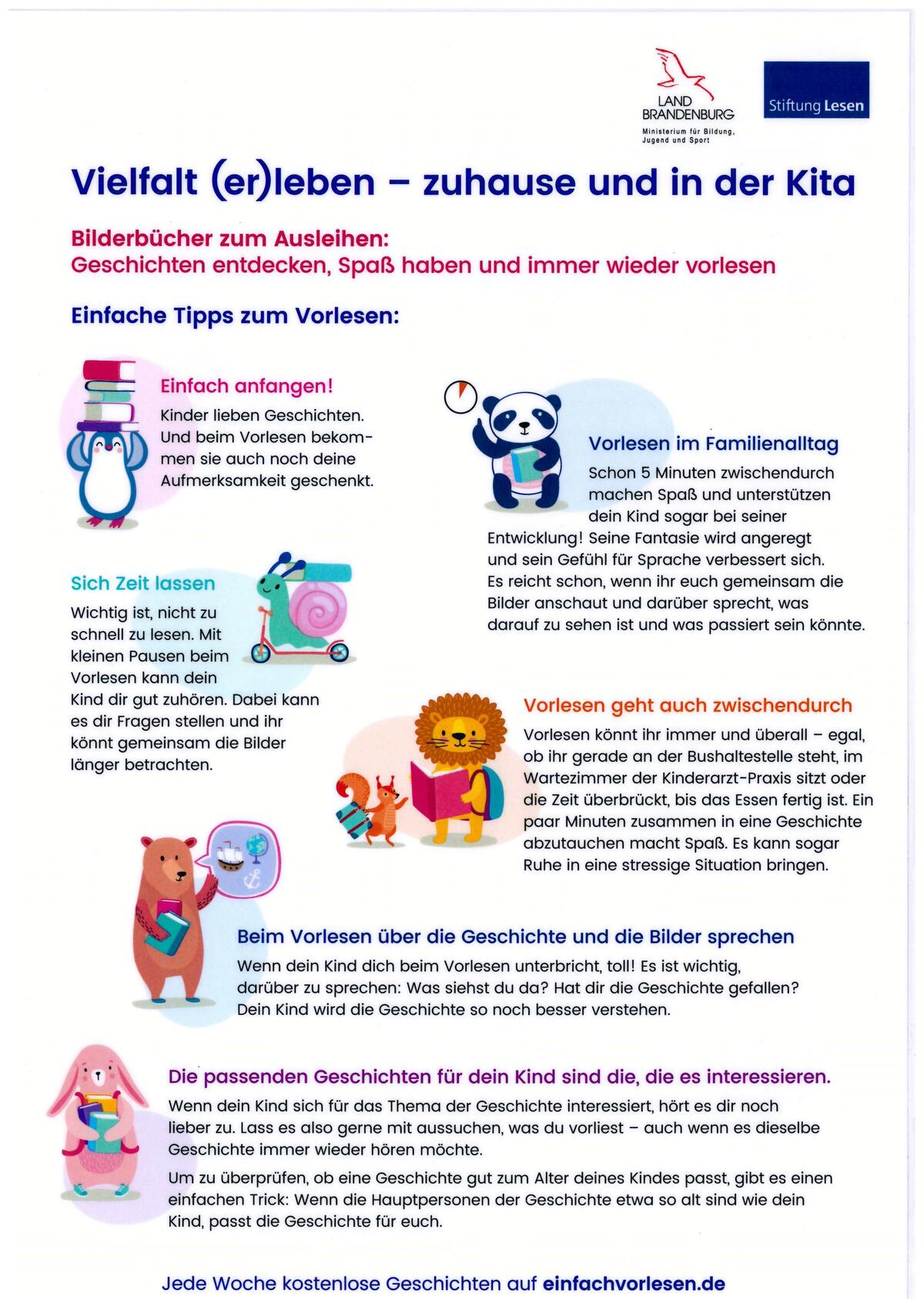 Unter diesem Motto verschenkte die Stiftung Lesen gemeinsam mit dem Brandenburgischen Ministerium für Bildung, Jugend und Sport 300 Vorleseboxen an Kindereinrichtungen in Brandenburg. Da in einer Kindereinrichtung Kinder, Eltern und Fachkräfte aus unterschiedlichen Kulturen und Lebensumständen aufeinandertreffen, sollte sich hier ein wertschätzender, sensibler und offener Umgang mit Vielfalt und Verschiedenartigkeit selbstverständlich widerspiegeln. Ein Mittel, um Kindern diese vielfältige Lebensrealität sichtbar zu machen, sind Bücher. Aus diesem Grund wurde eine Vorlesebox geschaffen und mit speziell zu dem Thema passenden Büchern gefüllt.
