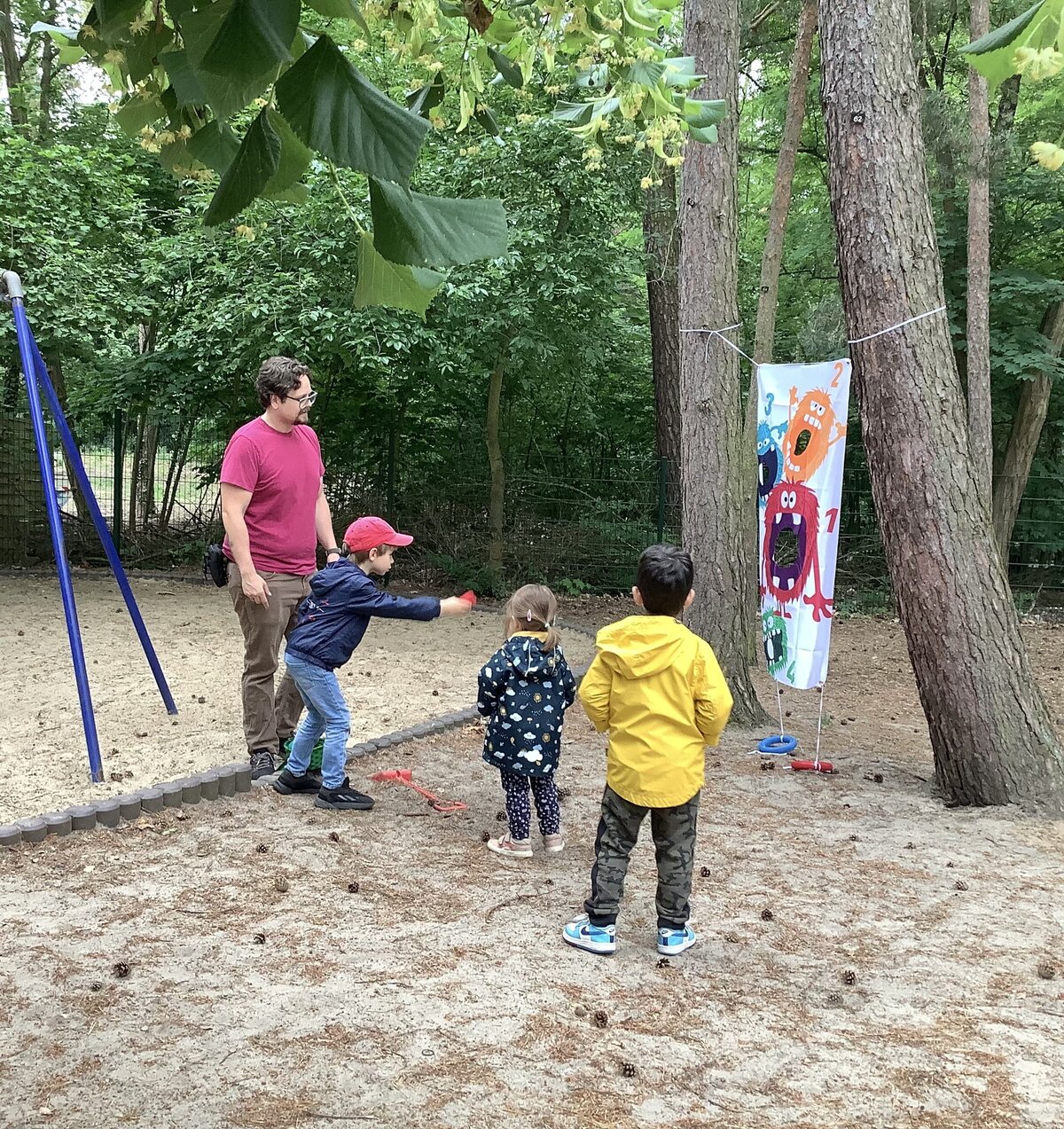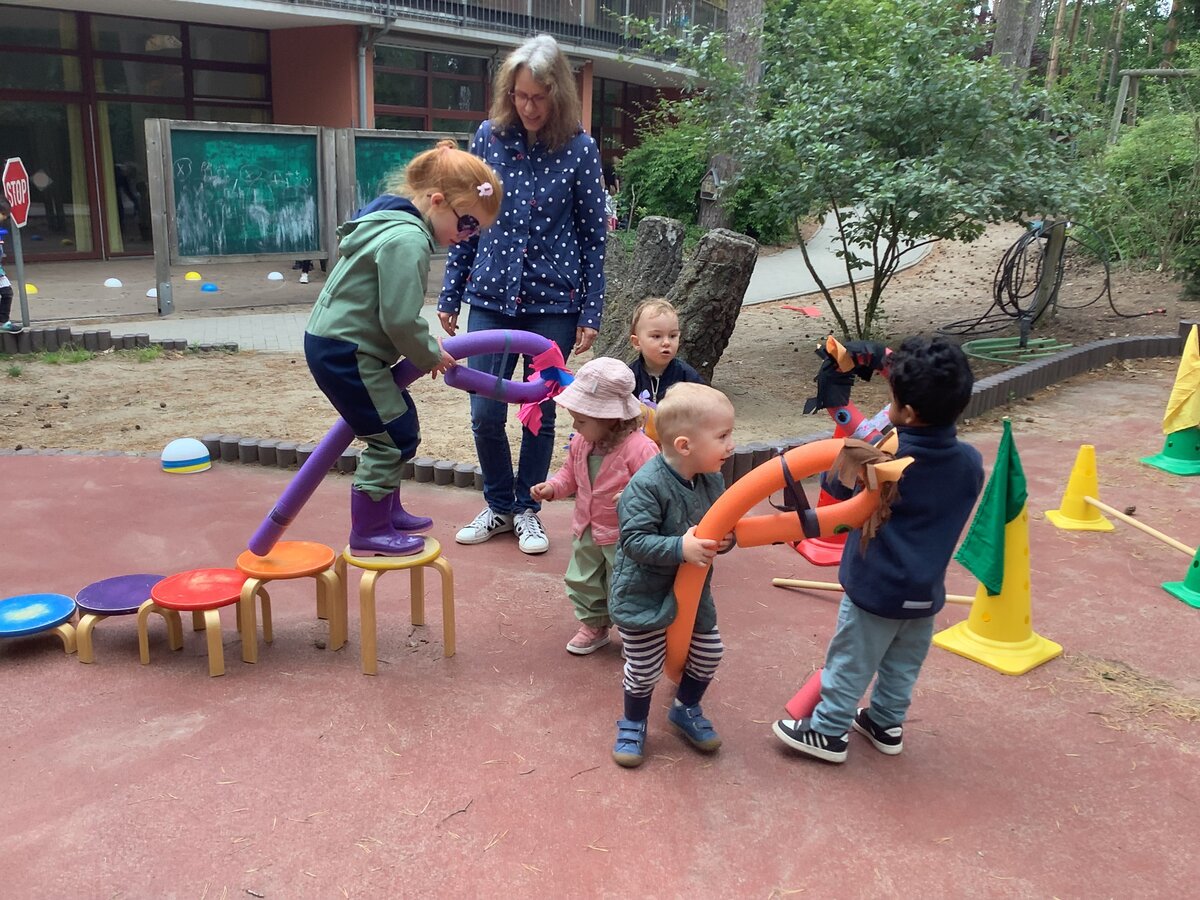 10. Juni 2025 mit einem Fest den Kindertag. Im Garten haben wir dafür verschiedene Stationen aufgebaut. Wir versammelten uns zunächst alle auf dem Bolzplatz, wo wir das Fest eröffneten. Die Kinder waren gespannt auf die verschiedenen Stationen und gingen sofort auf Entdeckungstour. Auf dem Bolzplatz hatten wir in der Zwischenzeit einen Parcour aufgebaut, an dem sich alle ausprobieren konnten. Ältere und jüngere Kinder waren mit Freude dabei und halfen sich gegenseitig beim Balancieren und Klettern. Auch mit den bunten Steckenpferden, die wir aus Poolnudeln gefertigt haben und die schon ungeduldig mit den Hufen scharrten, ritten die Kinder durch den Parcour. Dabei konnten sie ihre Motorik, ihr Gleichgewicht und ihre Fantasie fördern. Nebenan beim Säckchenwerfen auf bunte Monster stellten die Kinder ihr Wurfgeschick unter Beweis.