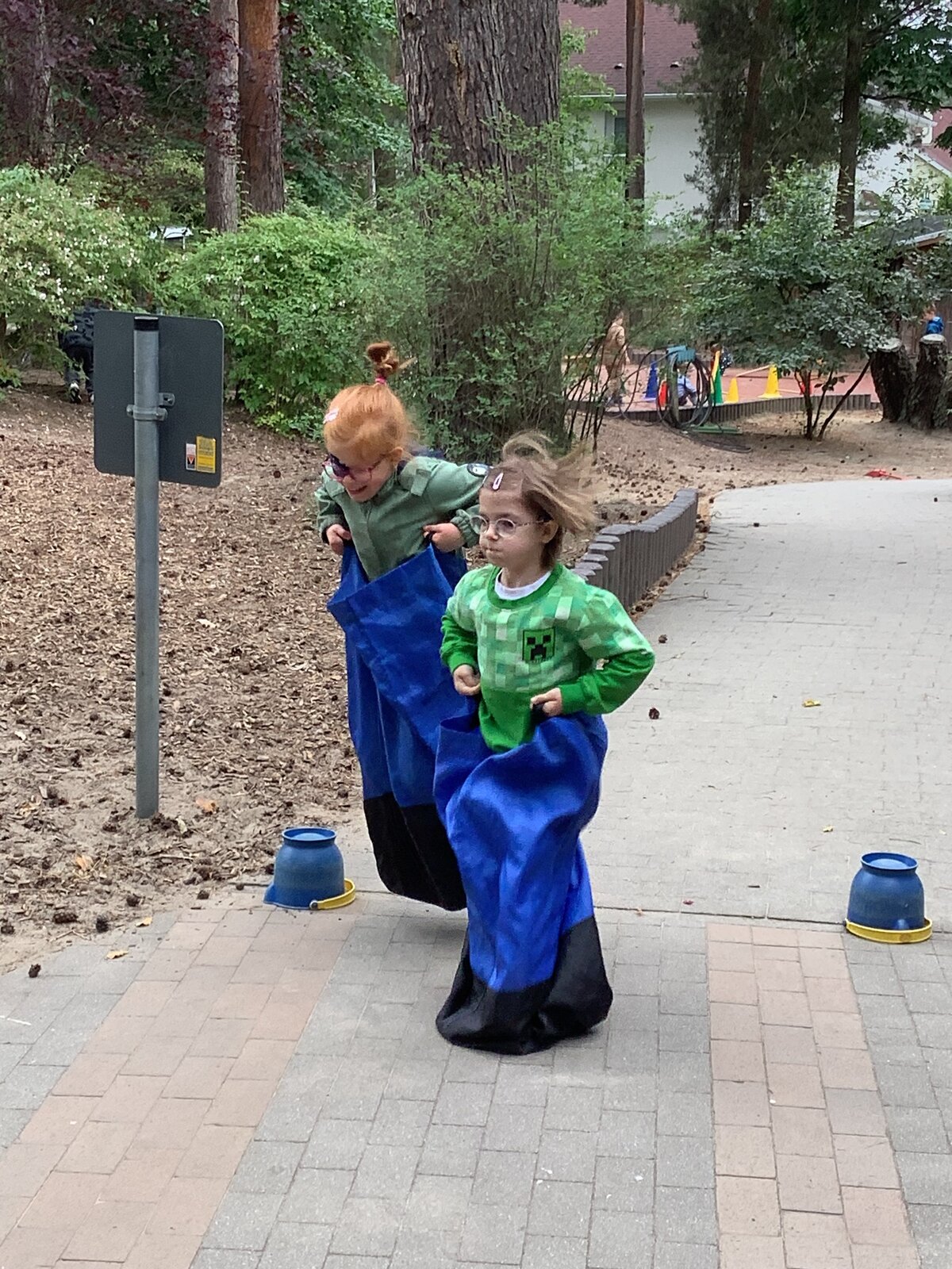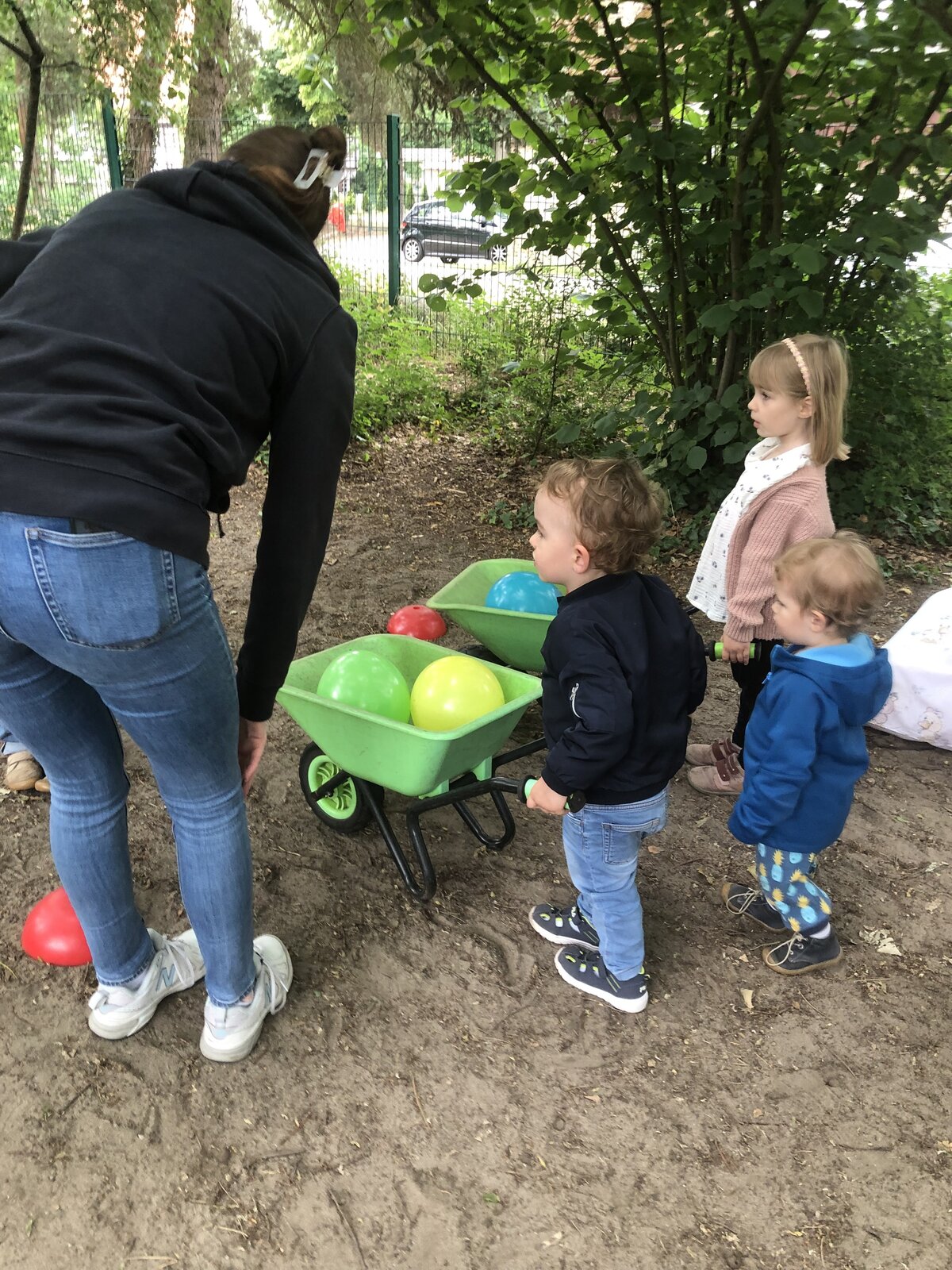 Auf die Suppenkellen - Fertig - Los - hieß es beim Kellen-Lauf mit Wasserballons. Die Kinder waren mit Feuereifer dabei und der eine oder andere geplatzte Wasserballon sorgte für zusätzlichen Spaß. Auch das Sackhüpfen brachte die Kinder und uns als pädagogische Fachkräfte gehörig zum Lachen, als wir zusammen um die Wette hüpften. Die Disco sorgte für eine fröhliche Stimmung und gute Laune und lud die Kinder dazu ein, sich zur Musik zu bewegen, was sie zahlreich taten. Beim Schubkarrenlauf konnten die Kinder Luftballons in einer Schubkarre durch ein Hindernis manövrieren. Entweder für sich oder zu zweit waren auch hier alle mit Spaß dabei. Eine Bastelstation hatten wir auch, an der die Kinder mit Papier, Schere, Stiften und Klebstoff ihr eigenes Eis am Stiel gestalten konnten.