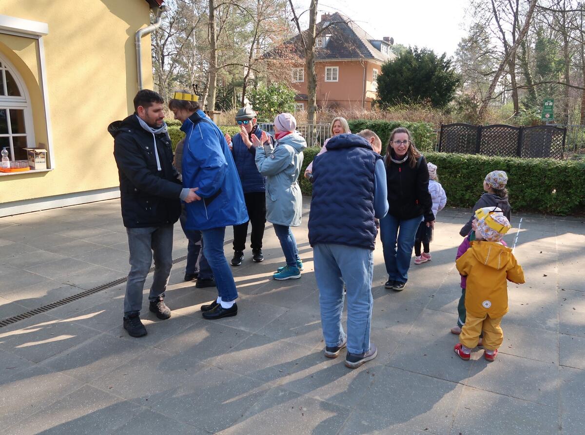 Zu Beginn begrüßten wir uns und den Frühling in einem Singkreis mit Frühlingsliedern. Unter anderem haben wir ein neues Lied aufgeführt. Dazu sind alle Kinder, die Lust hatten eine Hummel zu sein, in den Kreis gegangen und haben das Lied „Eine kleine Hummel fliegt rundherum“ (nach der Melodie „Alle meine Entchen“) gesungen.
